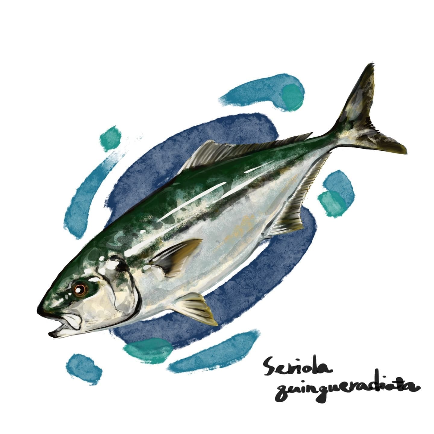 光沢のある身と脂の乗りで人気のハマチやブリ。寿司ネタとしては季節感もあり、イラストでは銀色のグラデーション表現が映えます。